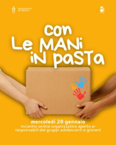 Mercoledì 28 gennaio alle ore 20.30 si è svolto un incontro formativo online rivolto ai referenti e ai responsabili dei gruppi che intendono partecipare a Con le mani in pasta, la raccolta di viveri e beni di prima necessità organizzata dai gruppi adolescenti della Diocesi in collaborazione con Caritas, in programma per sabato 11 aprile.