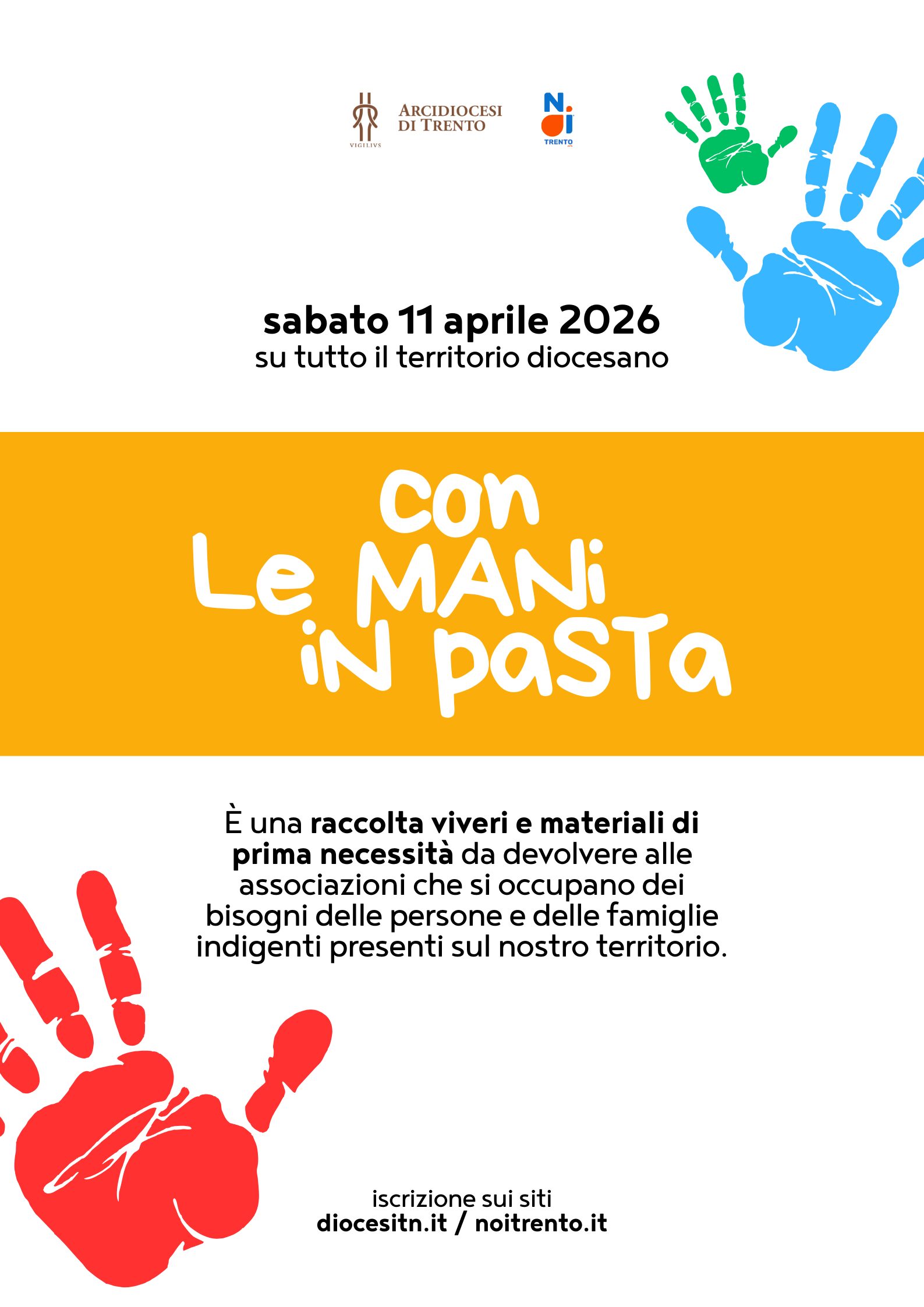 Scopo principale della giornata Con le Mani in pasta, prevista su tutto il territorio provinciale sabato 11 aprile, è quello di raccogliere aiuti per le realtà locali al quale si aggiunge uno sguardo attento alla collaborazione con i gruppi, le persone e le associazioni che sono presenti nelle diverse zone. Una giornata all’insegna del servizio, della gioia, dell’ascolto e dell’incontro.